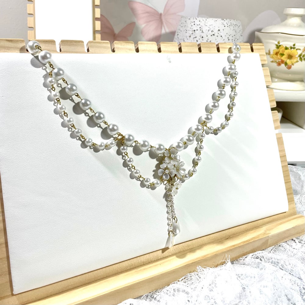 A romantic statement piece designed with layered pearls, delicate gold accents, and a blossoming floral centerpiece. Roselle captures a soft bridal elegance—perfect for weddings, formal occasions, or anyone who loves a timeless, feminine touch. Crafted to elevate any look with graceful charm and effortless sophistication.