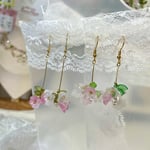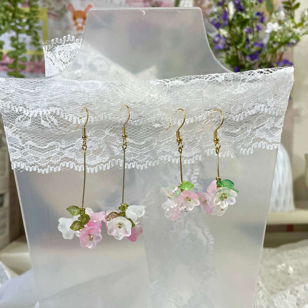 gentle and floral, these handmade earrings feature four clustered pastel glass flowers nestled against translucent acrylic leaves. at the base, a small glass pearl anchors everything in place, adding a soft finishing touch. the sleek 10k gold plated wire adds elegance without overwhelming the delicate charm of the design.