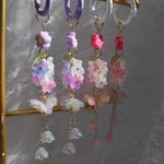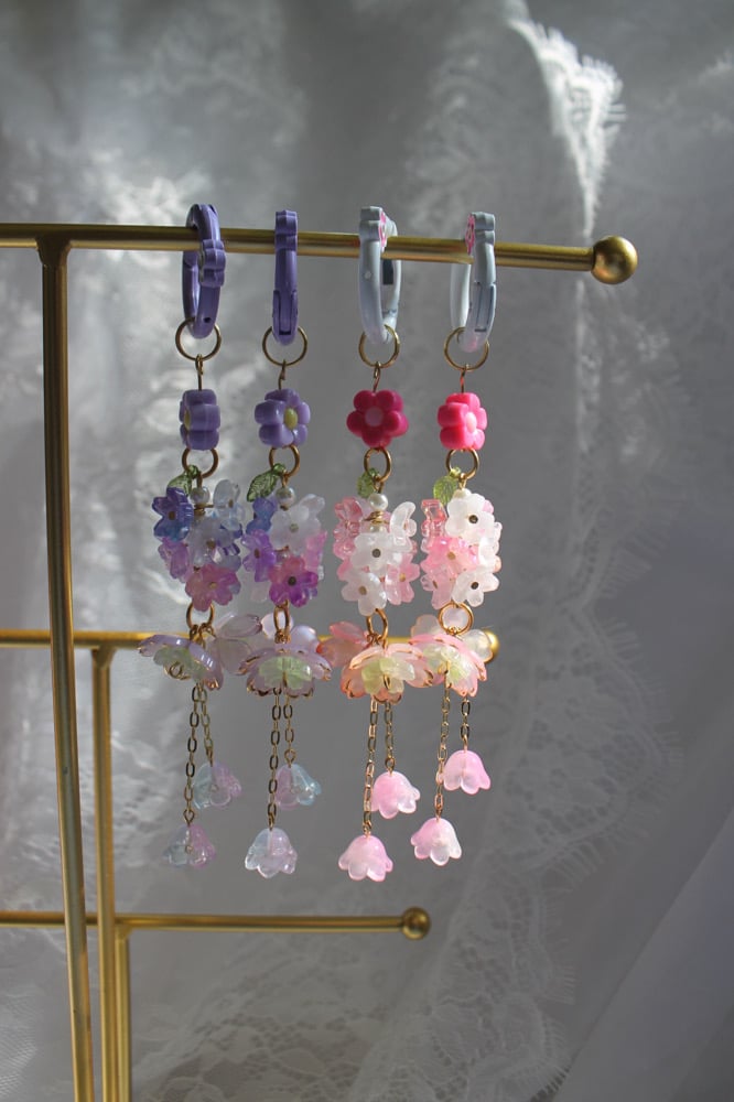 a soft, dreamy piece inspired by the delicate beauty of spring in full bloom. this charm features layered translucent flowers in pastel pinks, purples, and creams, accented with gold details and tiny dangling bells for extra whimsy.