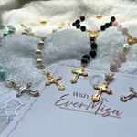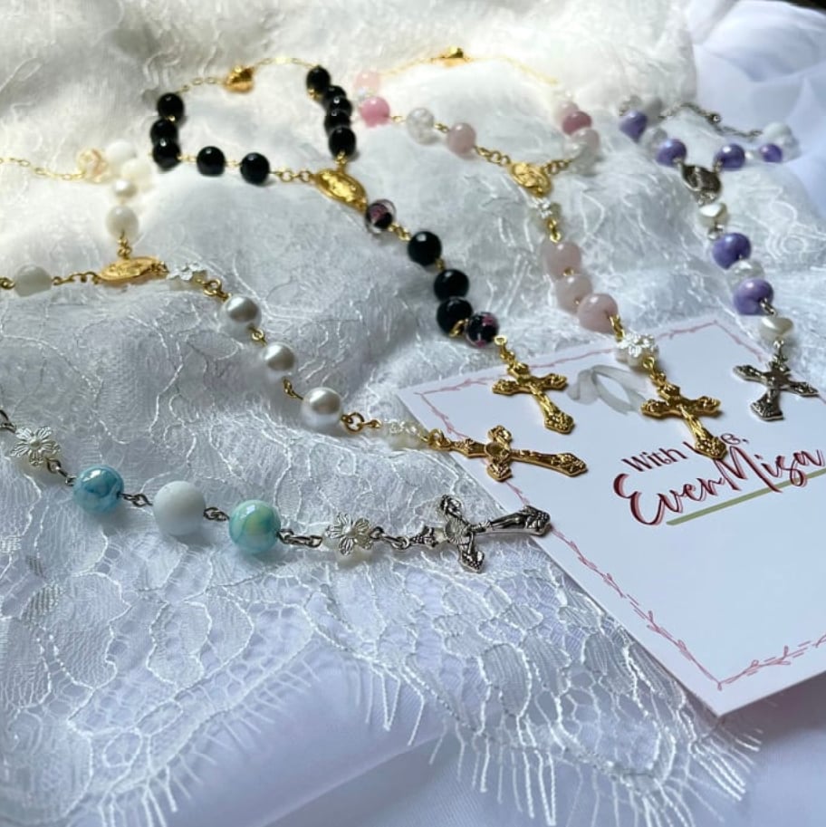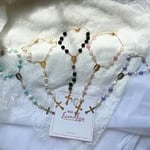 a delicate beaded charm inspired by classic rosaries, made for your rearview mirror, desk, or any space in need of quiet grace. it features a mary centerpiece and floral-detailed cross, but is designed as a decorative piece — not intended for formal prayer use.